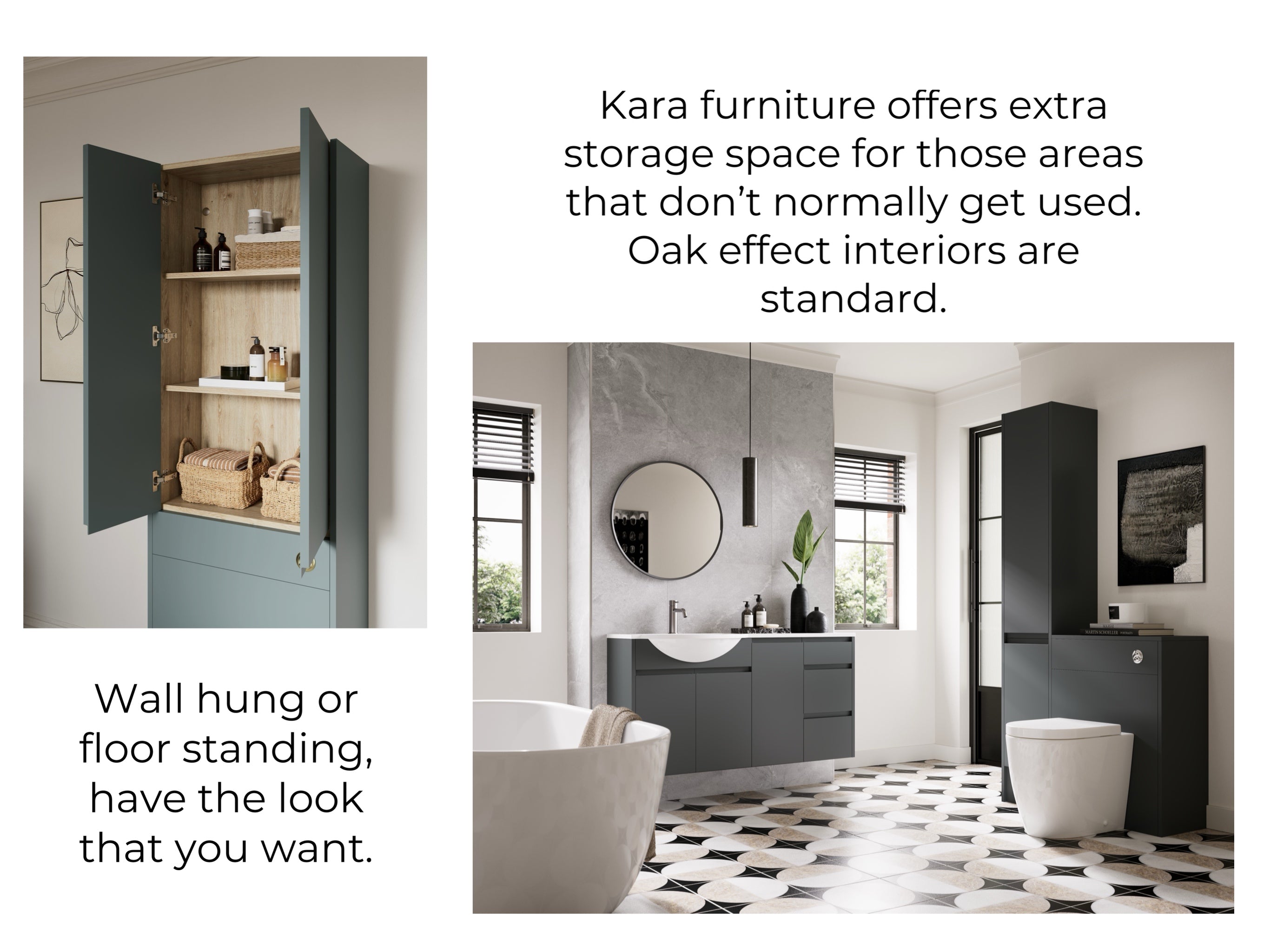 Kara bathroom furniture can have a solid formed basin the whole length of the stand alone units, or worktop and semi recessed basin on the standard depth units.